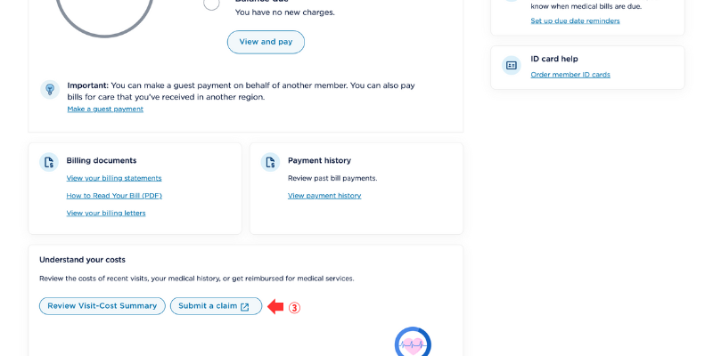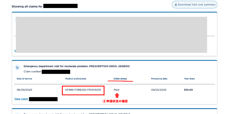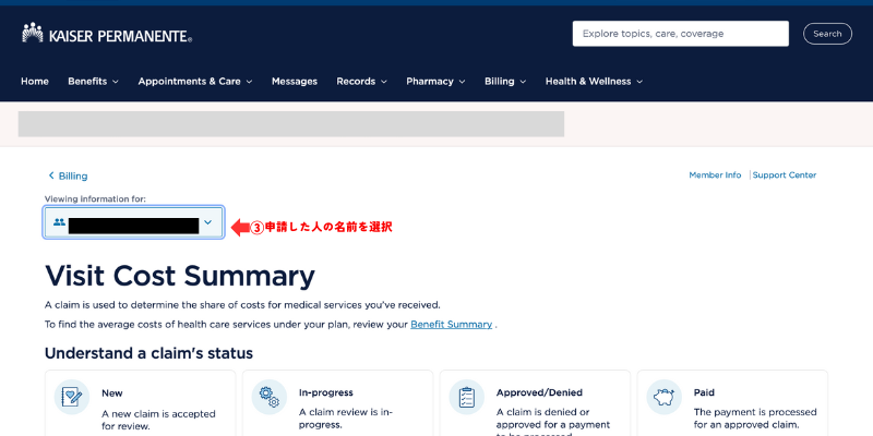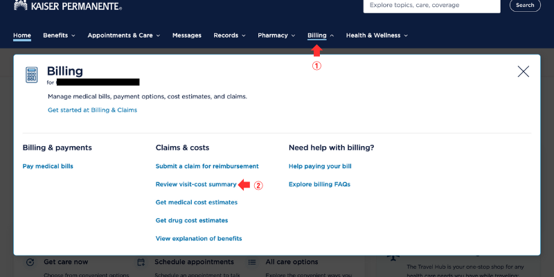- ①Billingをクリックして②Review visit-cost summaryをクリックします。