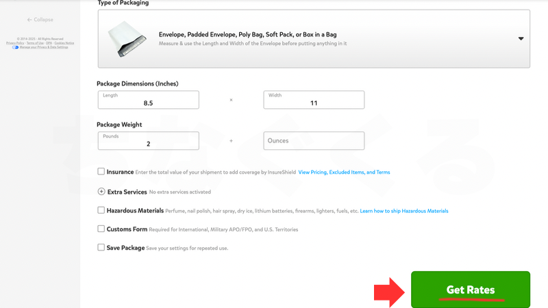 荷物のサイズと重さを入力して、「Get Rates」(料金を確認)をクリック